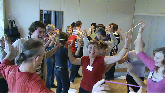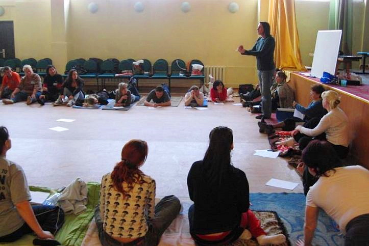 Представьте зал, в котором на полу сидят-лежат несколько десятков человек. Кто-то слушает, кто-то сладко посапывает, кто-то в носу ковыряет. Потом вдруг все вскакивают, начинают носиться взад-вперед и делать странные вещи – лаять, обниматься, сплетаться в смешные фигуры, говорить друг другу гадости и признаваться в любви. И так два дня подряд.